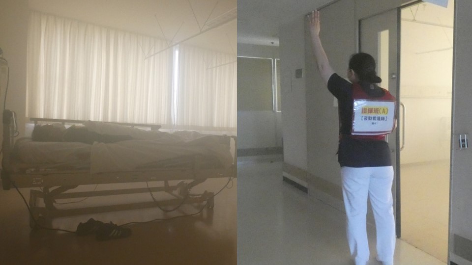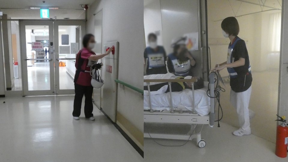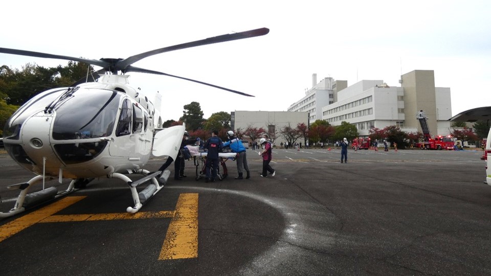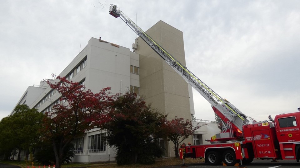 11月13日の合同消防訓練は、夜間(午前1時)に新館4階病棟の病室から出火し、逃げ遅れた患者が2名いるという想定で実施しました。病棟スタッフが火災を発見し、通報・連絡、初期消火、入院患者の避難誘導の訓練を行いました。避難誘導訓練では、病室にスモークマシンを設置し、煙が充満する部屋から患者を避難させました。また、枚方消防署による、放水訓練、取り残された入院患者2名の救助訓練、ドクターヘリ出動要請・離着陸支援訓練を行いました。はしご隊が屋上から患者1名を救助し、階段から救助された1名は重症のため、情報指令課から大阪大学医学部附属病院高度救命救急センターにドクターヘリを要請し、実際にヘリが出動しました。今後も、防火管理の強化と職員の防火に対する意識の向上を図ってまいります。