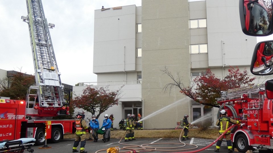 2025年11月13日に枚方消防署との合同消防訓練、12月11日に災害医療訓練を実施しました。
