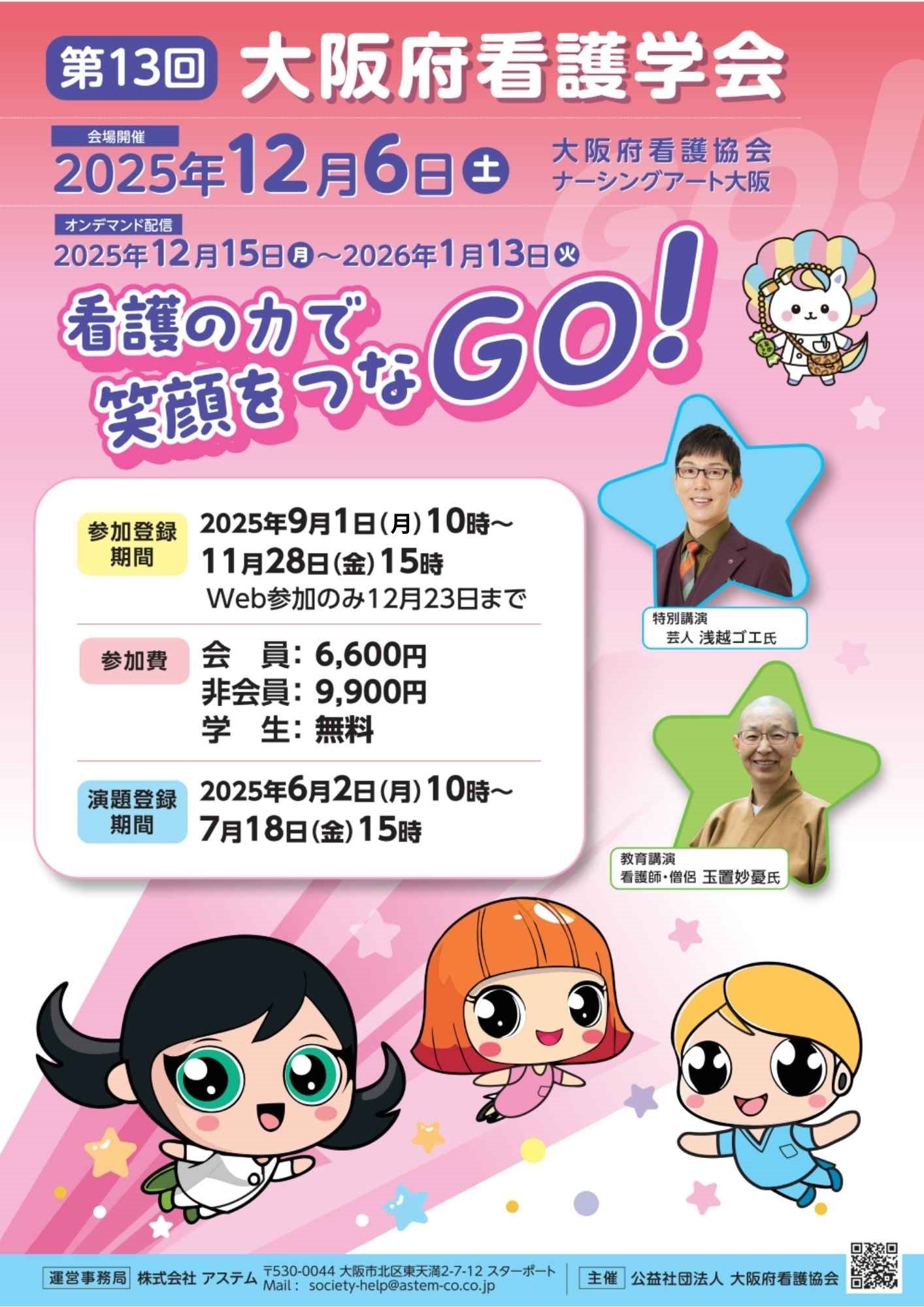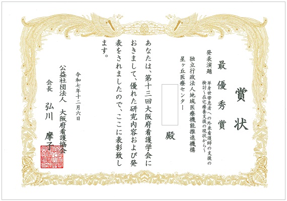 2025年12月6日、大阪府看護協会ナーシングアート大阪で開催された第13回大阪府看護学会において、外来の演題「単身者世帯患者への外来看護師の支援の検討~在宅療養支援の現状から~」が最優秀賞を受賞しました。